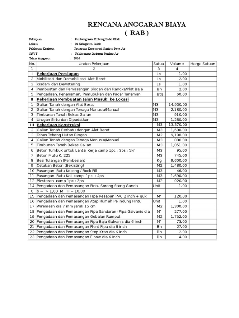 Contoh dokumen rab xls / contoh rab rumah excel download. Airnonakotamadya kupangnojenis pekerjaanvolumesatuanharga satuanjumlah harga(rp). Untuk itu kami mengemas berbagai file literatur proyek konstruksi baik berupa contoh rencana anggaran biaya (rab) beserta desain gambarnya, contoh laporan proyek, contoh dokumen tender/lelang proyek dan masih banyak lagi dalam sebuah perpustakaan file proyek konstruksi download sampel file sampel file : 109 bahasa didukung dan akan bertambah. Berikut adalah contoh rab sederhana dalam sebuah proyek perumahan.